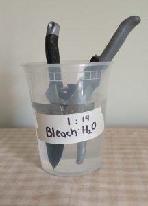 - Figure 4-9: Pruning tools soaking in a 1:14 household bleach solution. Johnson, Devon. 2022. CC BY-NC-SA 4.0.
