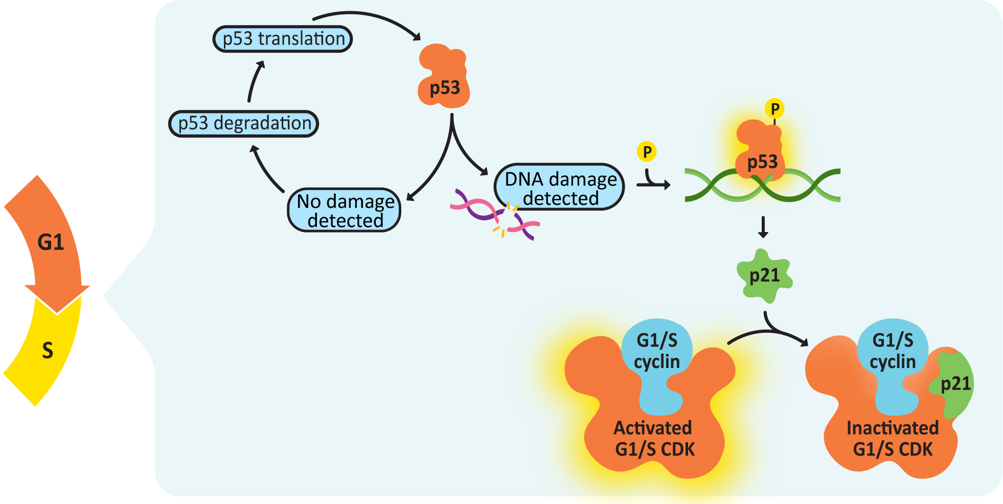 One of the most important criteria for the passing of the G1/S checkpoint is that there can be no detectable DNA damage. The protein that manages checking for DNA damage is a transcription regulator called p53. p53 is sometimes called “the guardian of the genome” because of the vital role it plays in ensuring that DNA remains intact and undamaged. It also functions in a way that is somewhat counterintuitive—in its inactive state, p53 is constantly translated and then immediately degraded (Figure 08-06). When DNA damage is detected, p53 gets phosphorylated, which stops it from being degraded. It then binds to the promoter sequence for a CDK inhibitor called p21, thereby activating its transcription and subsequent translation. p21 blocks the activity of the G1/S cyclin-CDK complex, which will stop the cell from passing the G1/S checkpoint.